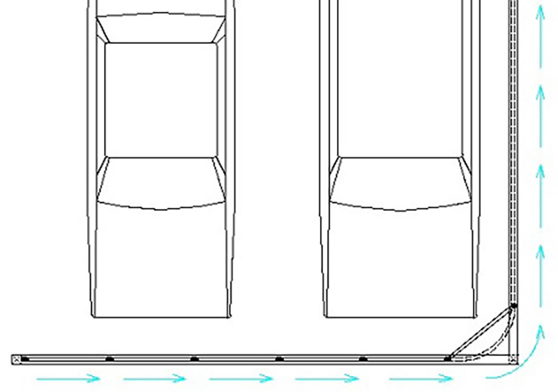 電車やモノレールなどのようにフェンスが一列に連なり、上部レールに吊られる形で動くようになっています。カーブレール(1本レール)も使用し、敷地に合わせてさまざまな角度での扉移動が可能です。そのため、幅10cmほどの狭いところでも設置・収納ができます。さらに開口はフルオープンになるので、開口を広く使いたい方にもおすすめ!レール角度や曲がり箇所も自由自在で、基本的にさまざまな敷地形状に設置可能となっています。