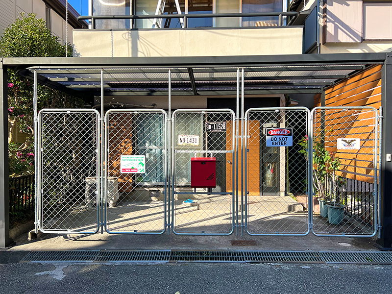 また、見通しの良いフェンスゲートとなりますので、ガレージなどの自動車等の盗難防止・強盗・押し売り・近頃は押し買い(一般に古物商等が不意に自宅等を訪問して、貴金属等の買い取りを行う営業のこと)などの防犯対策にピッタリ!不必要な訪問でも玄関前まで来られることなく、敷地境界線で抑止することができます。その他、小さなお子さまの前面道路への飛び出し防止など、たくさんの設置メリットがあります。